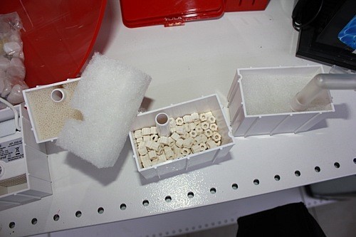 Фильтр состоит из четырех кассет, в нижней расположена помпа, в трех остальных наполнители: губки, биотрубки, угольная губка, синтепон.